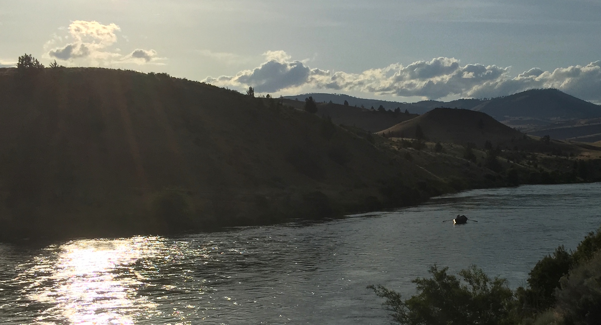 Evening light on the Deschutes and a drift boat gliding downstream.